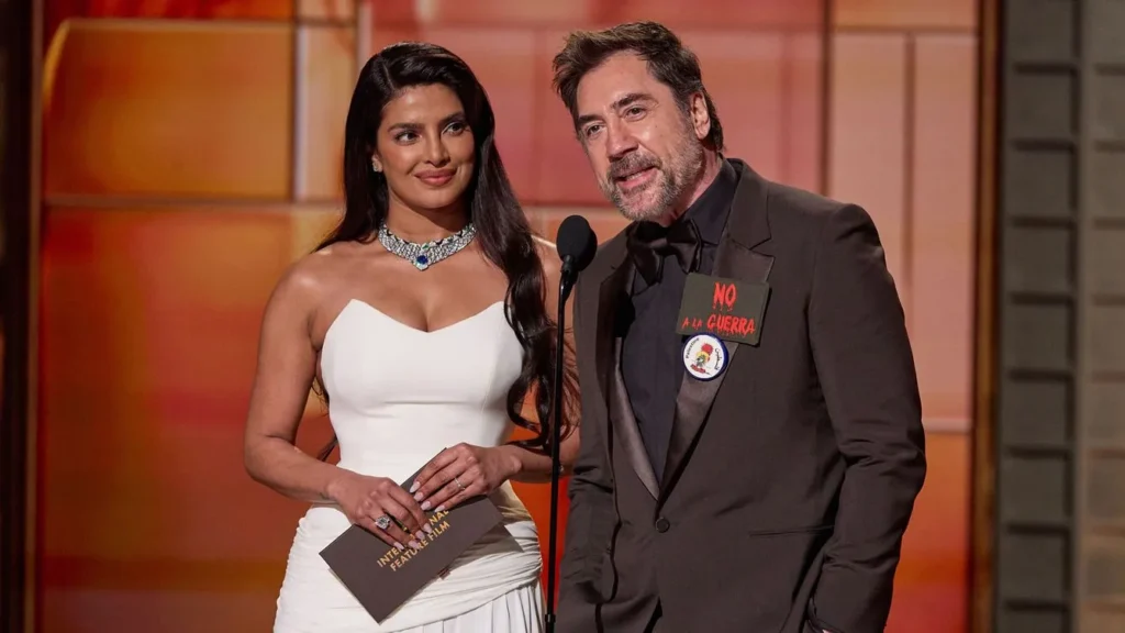 Javier Bardem, quien fue presentador de esta categoría junto a Priyanka Chopra, lució una chapa negra que decía “No a la guerra” en letras rojas. Fue la misma que usó en 2003 durante la invasión estadounidense a Irak. Cuando le tocó hablar, repitió las mismas palabras que aparecían en la solapa de su traje. Seguidamente, agregó: “libertad para Palestina”.